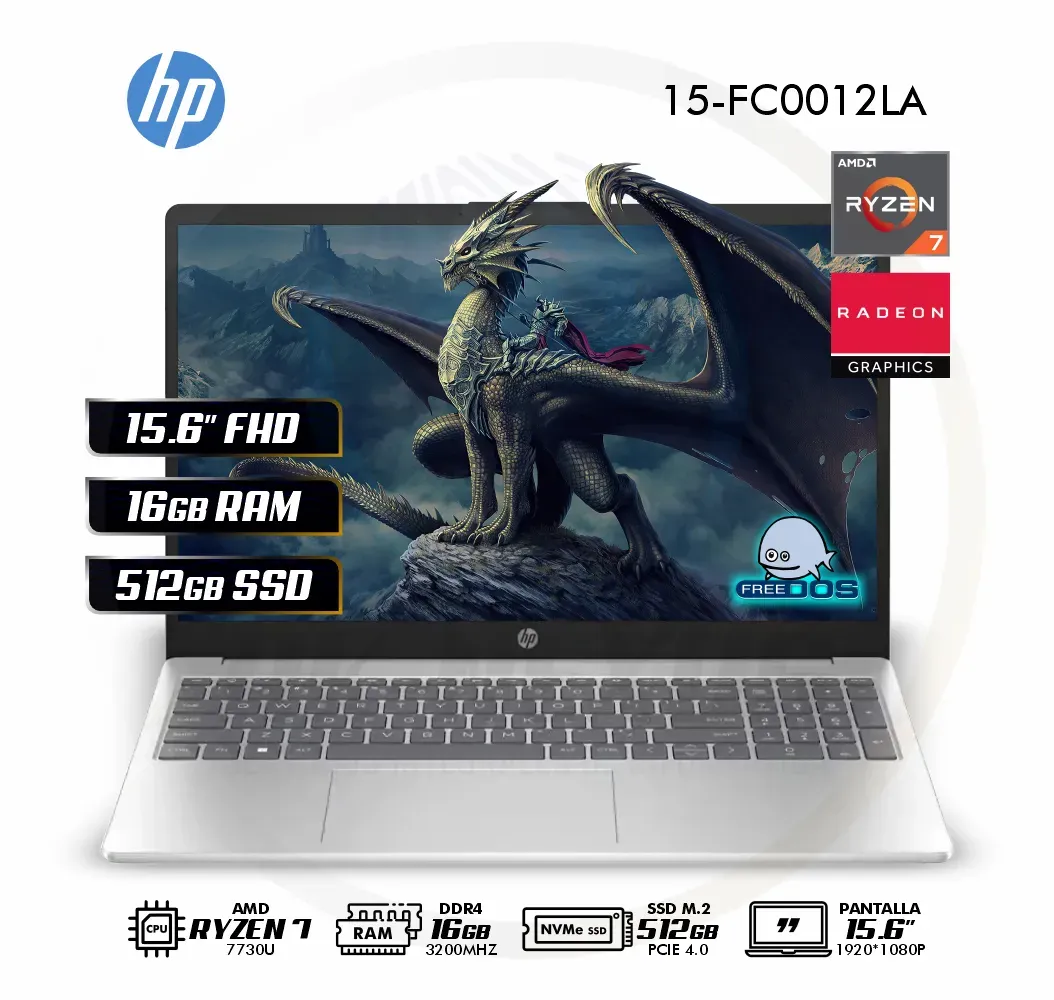 LAPTOP HP 15-FC0012LA / AMD RYZEN 7-7730U / RAM 16GB / SSD 512GB / 15.6PULG / FREEDOS / 802N1LA#ABM